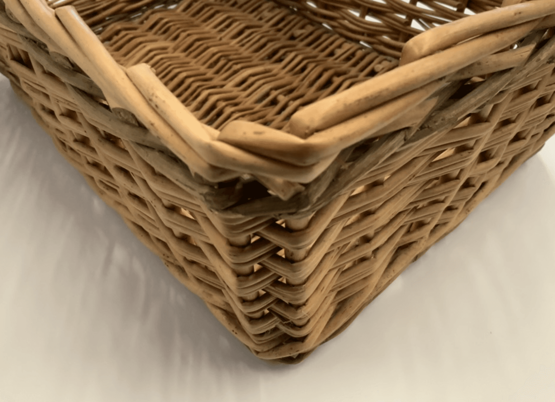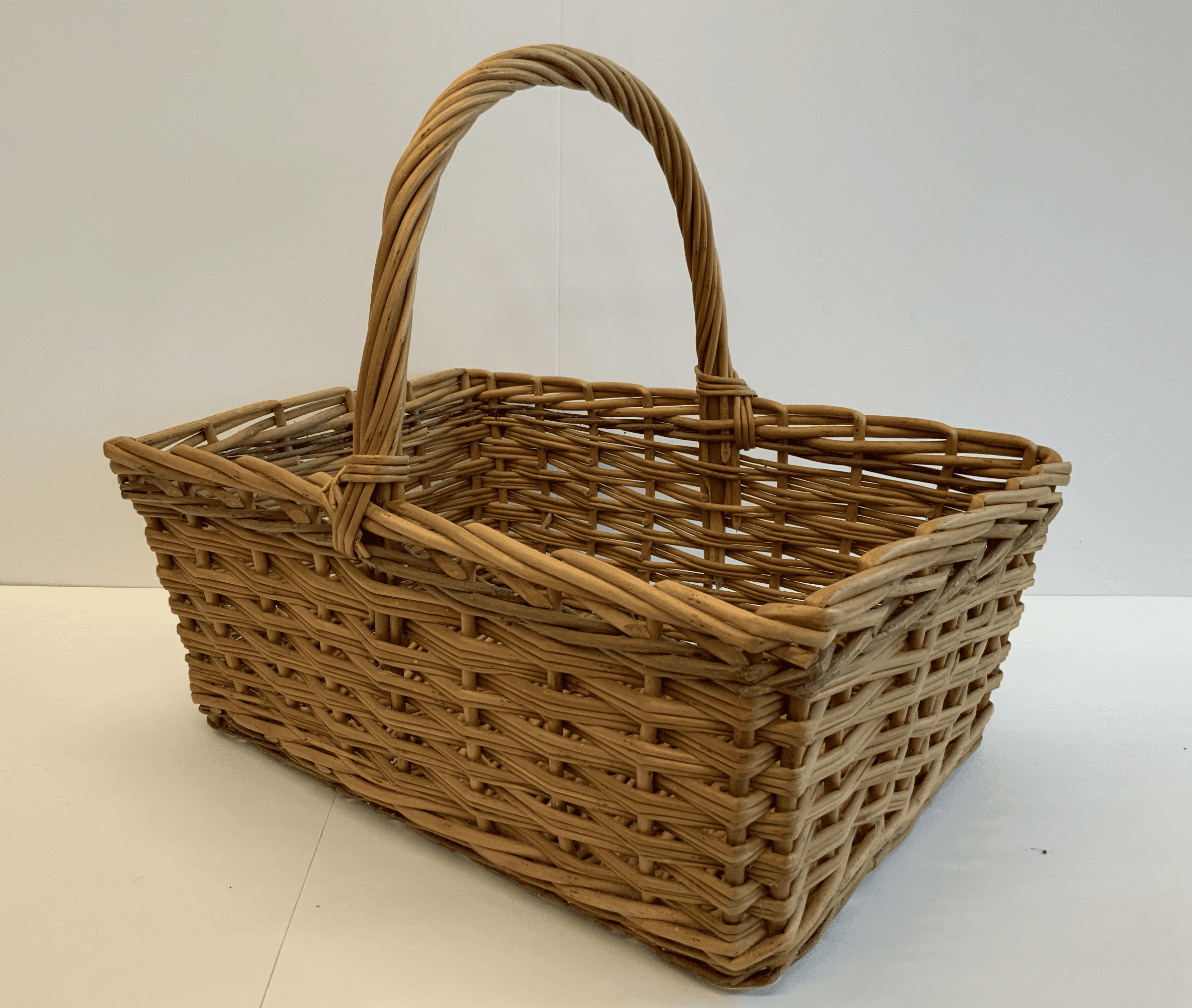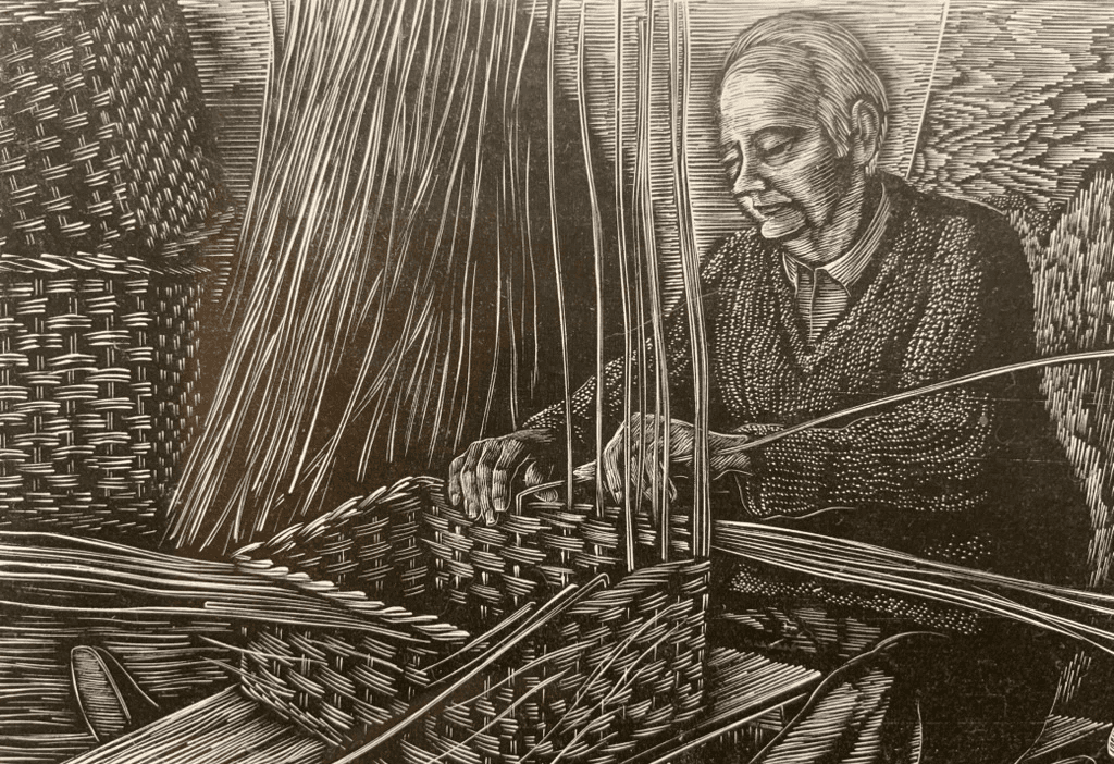 Jack Hembrow was a delightful man. He had been a Foreman in a basket factory. He wore a suit with a tie that was appropriate to the times he was raised, whether he was basketmaking or out in the fields, cutting willow. Being a willow basketmaker was considered a valuable profession. He drove a beautiful Morris Minor 1000. When I met him, he came in every day to weave “Square Shoppers”, making one in the morning and one in the afternoon. A lady from a local shop that sold willow baskets would come in every Tuesday to buy what he had made. Everyone in the shed was weaving on a plank with a lapboard. The door to the shed slid sideways with a wooden bolt that went into a hole in the door casing. There was a rough painted sign that urged “Put the wood in the hole”!